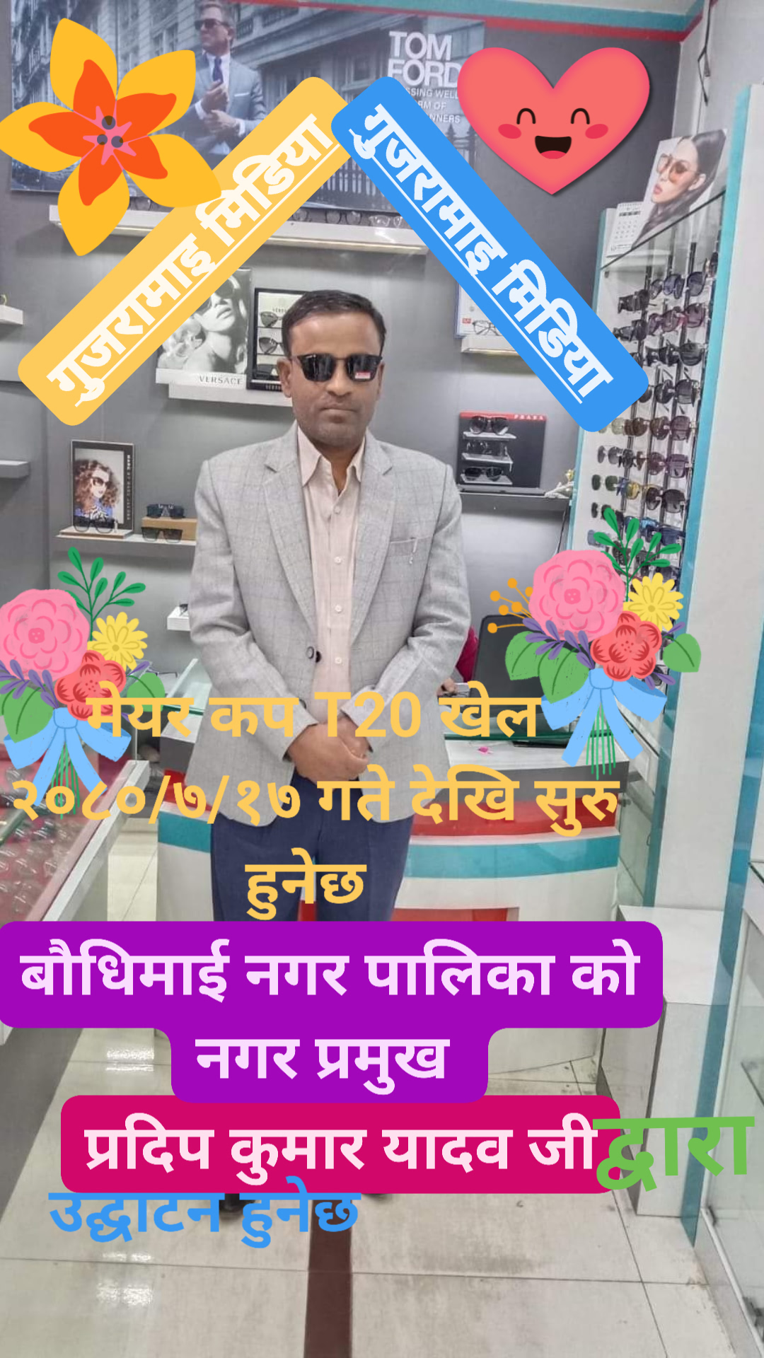 आज मिति २०८०/७/१३ गतेको सोमबार को दिन सम्पुरन कार्यपालिका सद्स्य वडा अध्यक्ष लगायत नगर प्रमुख,उपप्रमुख,प्रशासकिय अधिकृत शिक्षा संयोजक एक आपमा छ्लफल गरि सूचना प्रकाशित गरेको छ । रौतहट जिल्ला को बौधिमाई न.पा. मा मेयर कप T20 खेल को उद्घाटन नगर प्रमुख प्रदिप कुमार यादव ज्यु द्वारा उद्घाटन यहि २०८०/७/१७ गते देखि सुरु हुनेछ ,यस खेलमा सहभागी हुन को लागि सम्पुरन महानुभावहरु मा हार्दिक अनुरोध गर्द्छु।स्थान ,(गुजरामाई मंदिर को पास रहेको पर्ति मा )धन्यबाद