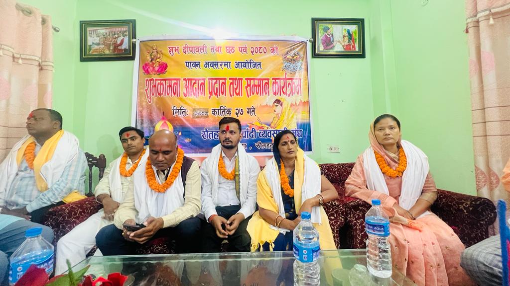 राैतहट । नेकपा एमालेका महिला नेतृ तथा संघिय सासद विणा देवी साहको प्रमुख आतिथ्यमा शुभदिपावली तथा छठ पर्वको अवसरमा शुभकामना र सम्मान कार्यक्रम गरुडामा सम्पन्न भएको छ । सो अवसरमा शुभकामना दिदै सासद साहले पृथ्वीलोकमा जहिले पनि सत्यको विजय हुदै आएको उनले बताए । असत्य गर्नेले केही समय उत्साहित भए पनि अन्त्यमा सत्यको नै विजय हुदै आएको उनले उदाहरण सहित स्पष्ट पारे । परिवारजन तथा सन्तान सुख तथा दिर्घायुको लागी छठपर्व हुदै आएको बताउदै सवै वर्गमा उतरोतर प्रगति तथा सुख शान्तिको कामना गरे । सुन चादी व्यवसायी संघ राैतहटको आयोजनामा भएको शुभकामना कार्यक्रममा विभिन्न क्षेत्रमा योगदान गर्ने व्यक्तिलाई सम्मान समेत गरिएको हो । संधका जिल्ला अध्यक्ष अरुणकुमार साेनीको अध्यक्षतामा भएको कार्यक्रममा गरुडा नगर उपप्रमुख पुनम चाैधरी , सुन चादी व्यवसायी संघ मधेस प्रदेसका अध्यक्ष रामजी साह, गरुडा नगर प्रमुख प्रत्यासि बृज किशोर यादव , गरुडा नगर प्रमुख प्रत्यासि दिपक यादव , गरुडा नगर उधाेग वाणिज्य संघका पुर्व अध्यक्ष राम भराेस यादव , गरुडा नगरपालिका वा नम्बर २ का अध्यक्ष कृष्णनन्दन सहनी ,वडा नम्बर ३ का अध्यक्ष अम्बिका सहनी , वडा नम्बर ५ का अध्यक्ष राम विनाेद साह ,वडा नम्बर ६ का अध्यक्ष रामबाबु चाैधरी ,वडा नम्बर ९ का वडा अध्यक्ष राजेश सहनी सहितका वक्ताले शुभकामना व्यक्त गरेका थिए । साे अवसरमा गरुडा उधाेग वाणिाज्य संघका अध्यक्ष सुनिल साह , वरिष्ठ उपाध्यक्ष सुशील साह,उपाध्यक्ष राम ईशवर साह ,महिला सदस्य शुसिला देवि,नेकपा एमाले गरुडा नगर कमिटी अध्यक्ष अन्जनी साह,गरुडा बहुमुखी क्याम्पस अध्यक्ष लक्षमण साह,हाम्रो रिण वचत सहकारीका अध्यक्ष हरेन्द्र जयसवाल ,लायन्स कल्ब गरुडाका अध्यक्ष हरेन्द्र यादव ,युवा नेता लक्ष्मी साह र सन्तोष साहको उपस्थितिमा कार्यक्रम भव्यताका साथ सम्पन्न भएको संधका उपाध्यक्ष कामेश्वर नाथ साहले बताए ।
