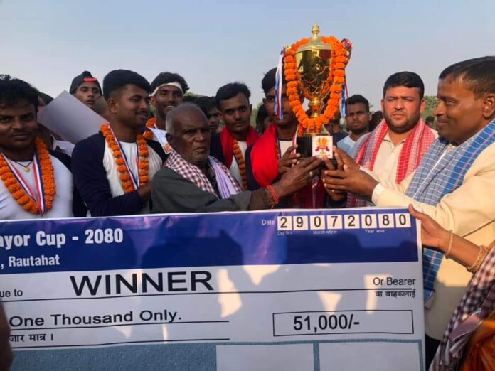रौतहटको बौधिमाई नगरपालिकाको मेयर प्रदिप यादवले विजेता तथा उपविजेता टीमका उत्कृष्ट खेलाडीलाई सम्मान गर्दै उनीहरूलाई अन्तर्राष्ट्रियस्तरमा खेल्न हेर्न सपना रहेको बताउनुभयो।