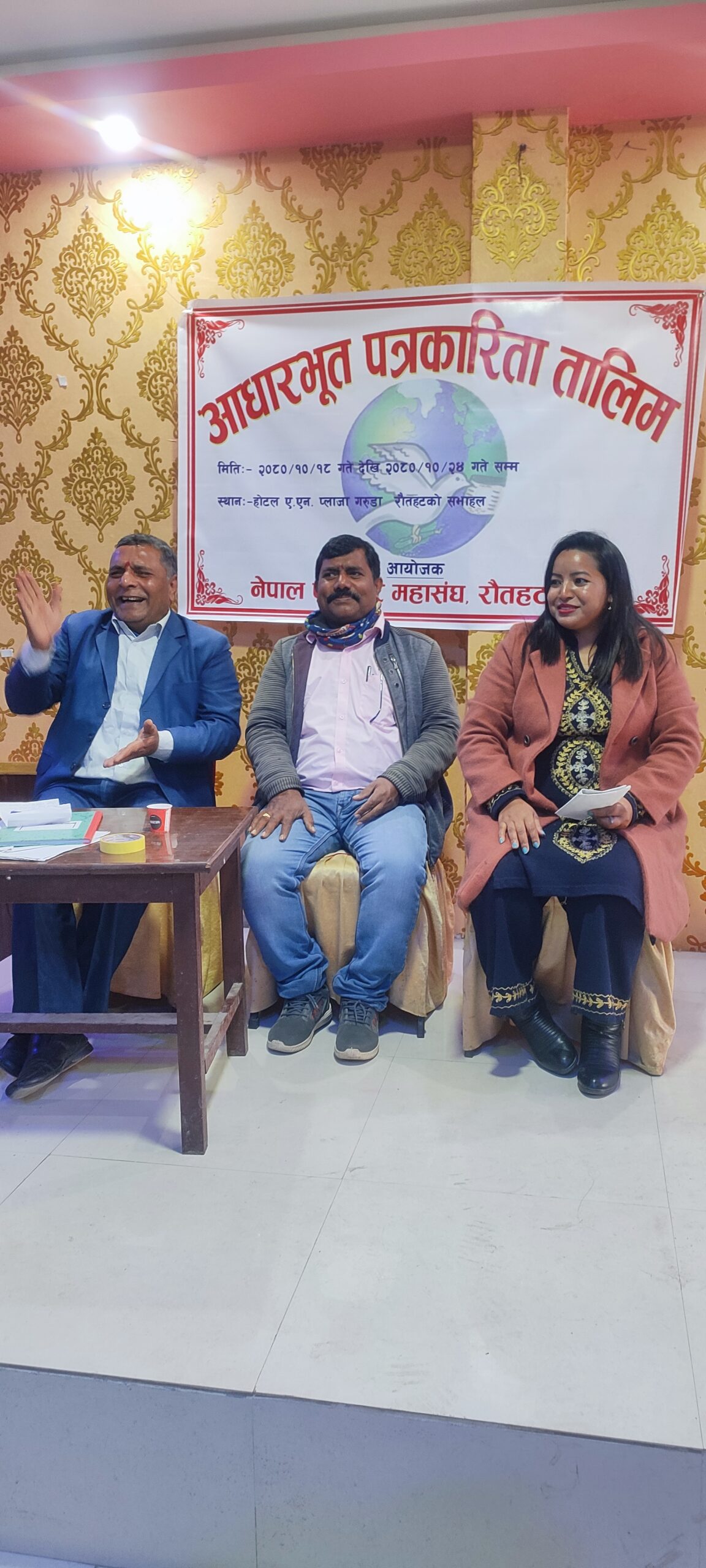 माघ २१ गते नेपाल पत्रकार महासंघ रौतहट शाखा को आयोजना गरेको आधारभुत पत्रकारिता तालीम को चौथो दिनमा आदरनिय प्रेमचन्द्र झा ज्यु र रानी साह ज्यु ले मलाई अध्यक्ष पद को जिम्मेवार दिनुभएको ले दुबै जनालाई गुजरामाइ मिडिया को संचालक अरमान कुमार उपाध्याय को तर्फ बाट हार्दिक धन्यवाद तथा अभार प्रकट गर्दछु ।आजको तालिम मा पत्रकार साथीहरू अध्यक्ष को अनुशासन मा रहि शान्ति पुर्ण तरिकाले पालन गर्नुभएको मा वहालाई पनि धेरै धेरै धन्यवाद।