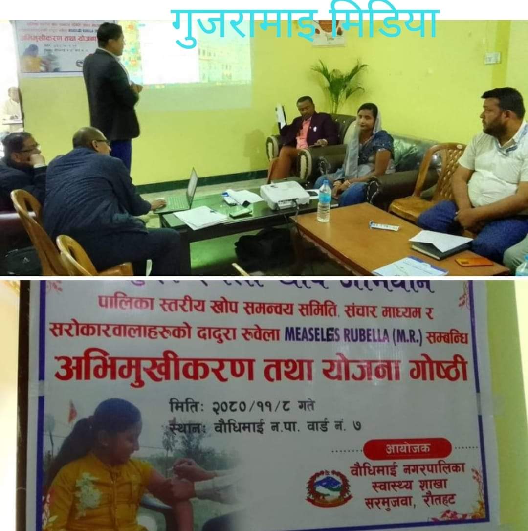 बौधिमाई नगरपालिकाका स्वास्थ्य शाखाको आयोजनामा नगरपालिकाको सभाहलमा उक्त दादुरा रुबेला खोप अभियान सम्बन्धि अभिमुखीकरण तथा योजना गोष्ठी कार्यक्रम आयोजन बाेलाईएकाे थिए । यही फागुन ८गते देखी १२ गते सम्म नगरपालिकाको वडा नं.-१ देखि वडा नं. ९ सम्मका सम्पूर्ण विद्यालय, समुदाय र स्वास्थ्य संस्थामा उक्त कार्यक्रम संचालन हुने बताइएको छ ।