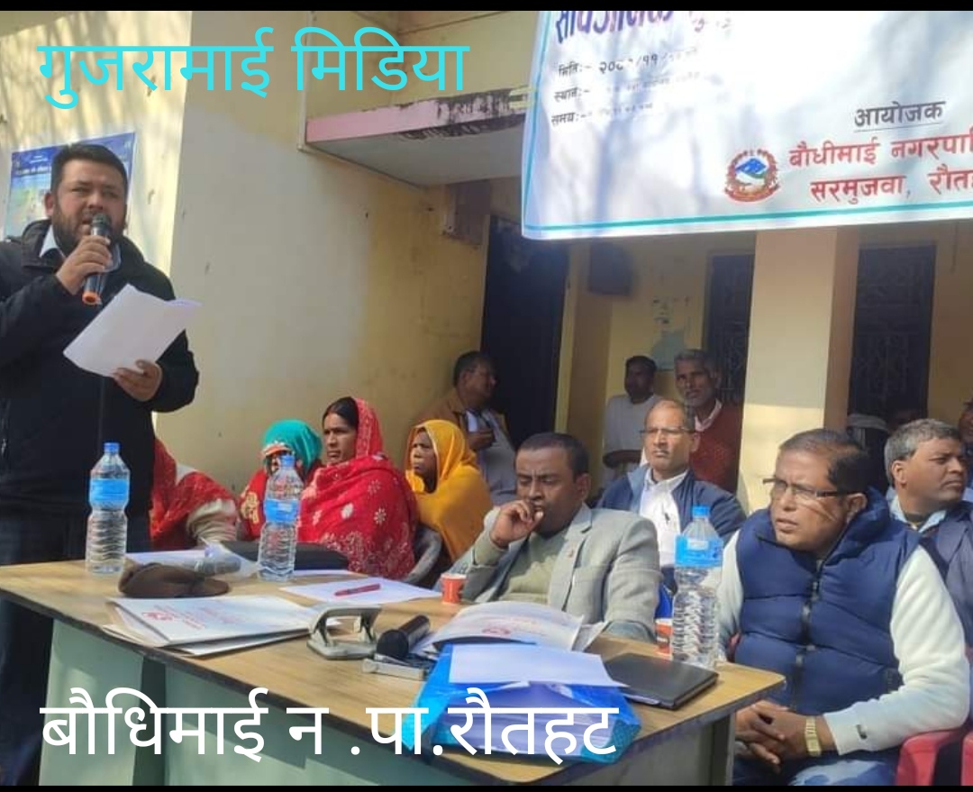 १७ गते फाल्गुन अरमान कुमार उपाध्याय                                                   रौतहट जिल्ला को बौधिमाई नगर पालिका मा आज देखि सार्वजनिक सुनुवाइ कार्यक्रम   भइरहेकाे  छ।बौधिमाई नगर पालिका को वडा नं १ अजगैबी र .वडा नं.२ इनर्वा वडा कार्यालयमा वडा अध्यक्ष रामजोधी राउत र धर्मेन्द्र पटेल ज्युको अध्यक्षतामा बौधिमाई नगर पालिका को आयोजना मा गरेको सार्वजनिक सुनुवाई कार्यक्रम २०८० /८१ मा प्रदान गर्ने सेवा ,सुबिधा ,सेवा प्रवाह तथा संचालन हुने नगर प्रमुख प्रदिप कुमार यादव ज्यु द्वारा उद्घाटन भएको हो।यस् कार्यक्रम को प्रमुख अतिथि नगर प्रमुख प्रदिप कुमार यादव ,बिशिस्ट अतिथि प्रशासकिय अधिकृत प्रमोद यादव ,लेखा प्रमुख अरबिन्द यादव ,शिक्षा संयोजक रमेष यादव ,लगायत स्वास्थ शखा प्रमुख, ताकेशवर पटेल ज्यु को उप्स्थित मा सम्पन भएको हो।आजको सार्वजनिक सुनुवाइ कार्यममा नगर प्रमुख यादव ज्यु ले शिक्षा ,स्वास्थ्य ,कृषि मा नगर पालिका भित्र रहेको सम्पुर्न सेवाग्राही लाई सेवा दिने वहाले भनेका थिए ,यादव ज्यु को कुरा सुन्दा धेरै खुशी लागे,जान्ताहरुले आफ्नो अमुल्य मत गरे ,त्यस् पछि बिजय भए ,तर ५ साल को लागि जान्ताहरु को हर दुख मा साथदिने हो ,वहाले बताय,जान्ताहरु को हित को लागि काम गर्ने ,सेवा दिने बताय, केहि बिपक्षी पार्टी ले ,१ साल को समय गुमाए दिए ,।यो बैठक के को लागि हो?सार्वजनिक सुनुवाइ के को लागि हो?यो तपाई हरु को वाड मा के को कमि कमजोरी ,के को सम्स्या छ,त्यही सम्स्यालाई समाधान गर्नको लागि नगर प्रमुख यादव ज्यु ले भन्नु भएको थिए ,शिक्षा सम्बन्ध बारेमा यही नगर पालिका शिक्षा संयोजक रमेष यादव ले नगर पालिका भित्र १६ बिधालय मध्ये,मा.बि.३,नि.माबि ४ र प्राबी ९ रहेकोहो खुलासा गरे ,नगर भित्र को सम्पुर्न बिधालय मा विद्यार्थी को कुल संख्या ८८२४ मध्ये केटी (महिला ४७०४ र केटा (पुरुष )मध्ये ४१२० शिक्षा संयोजक रमेष यादव ले बताए ।