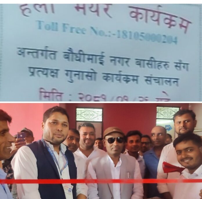 बैशाख २६ गते       अरमान उपाध्याय                                                  बौधिमाई नगर पालिका अन्तर्गत हेलो मेयर ,गुनासो कार्यक्रम को उद्घाटन नगर प्रमुख प्रदिप कुमार यादव ज्यु को हातले रिबन काटि सुरु भएको छ।आजदेखि संचालन हुने हेलो मेयर कार्यक्रम मा सहभागी भएको यही नगर पालिका को क्रमचारी , शिक्षा संयोजक ,रमेष यादव ,स्वास्थ्य शाखा प्रमुख ताकेशवर पटेल,राकेश यादव ,पंन्जिकरन शाखा प्रमुख ,बिकि प्रसाद जयस्वाल,प्रशसन शाखा प्रमुख दिलबिक्रम साह लगायत यस नगर पालिका को सम्पुरण राष्ट्र सेवक क्रमचारी को रोहवरमा उद्घाटन भएको हो।रौतहट जिल्ला को पालिका मध्ये first न.मा बौधिमाई नपा ले सुरु गरेको हो।यो पालिका भित्र रहेको सम्पुर्न स्कुल ,स्वास्थ्य चौकी ,वडा कार्यलय मा केहि गुनासो छ भन्ने ,प्रत्यक्ष गुनासो हेलो मेयर को toll free number मा ntc सिम ले कौल गरेमा केही रुपैया लाग्ने छैन । यहि नगर भित्र को कुनै पनि बिधालय मा शिक्षक ले ghanti leajer गरेको मा तुरुन्त हेलो मेयर toll free number मा कौल गर्नुहोला।धेरै धेरै धन्यवाद मेयर साहेब ,तपाईले गरेको काम एक दम सराहनिय हो। toll free number ,181050 00204