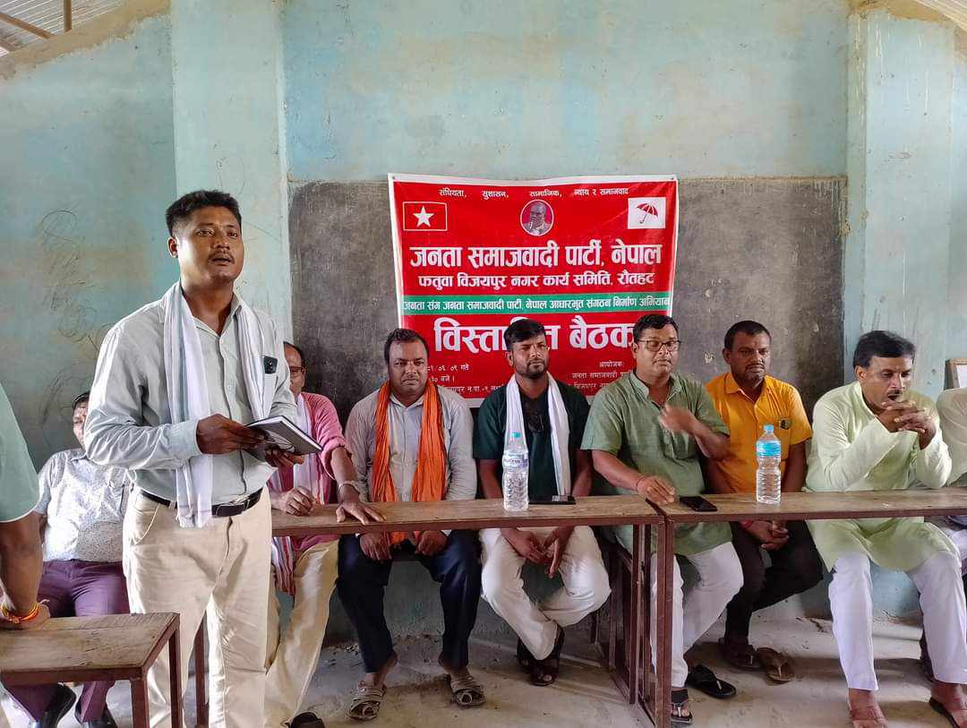 रौतहट जिल्लाको उतरी र पश्चिमी भेगमा रहेको फतुवा बिजयपुर नगरपालीकामा जनता समाजवादि पार्टि नेपालकाे विस्तारित बैठक भब्यताका साथ सम्पन्न भएको छ। मन-मनमा जसपा, घर-घरमा जसपा नाराका साथ जनता समाजवादी पार्टी नेपाल फतुवा बिजयपुर नगरकार्य समिति राैतहट द्वारा बुधबारका दिन साे नगरपालिकाकाे वडा नम्बर ९ लक्ष्मिनियामा नगर स्तरीय अगुवा कार्यकर्ता भेला आधारभूत संगठन निर्माण अन्तर्गत तथा विस्तारित बैठक कार्यक्रम सम्पन्न भएको हो ।