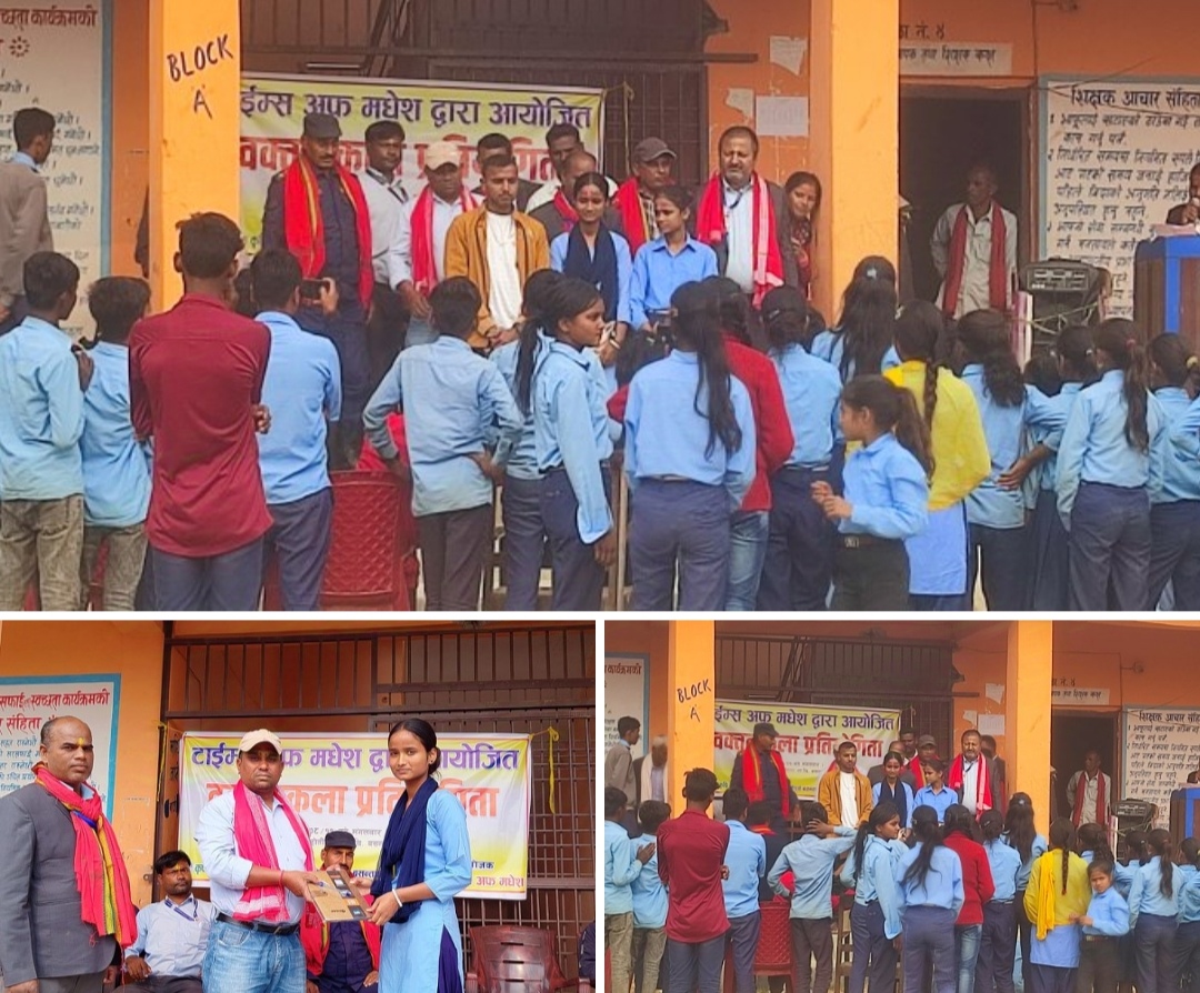 मंसिर ११ गते अरमान कुमार उपाध्याय अन्होती लाल माध्यमिक विद्यालय बसन्तपट्टिको प्राङनमा टाईमस अफ मधेस द्वारा आयोजना गरिएको शिक्षाको महतव विषयक वक्तृतवकला प्रतियोगीता भव्यताको साथ सम्पन्न भएको छ । परोहा नगरपालिका वडा नम्बर ६ मा रहेको श्री अन्होतिलाई माध्यमिक विद्यालयका कक्षा ८ देखि कक्षा १२ सम्माका छात्र , छात्राहरुको सहभागिता रहेको सो कार्यक्रमका अध्यक्षता विद्यालयका कुशल प्रधानाध्यापक यदुनी दास सरले गरेका थिए भने प्रमुख अतिथिका रुपमा परोहा नगरपालिकाको वडा नम्बर ६ बसन्तपट्टिका वडा अध्यक्ष रामविलास जैसवार उपस्थित भएका थिए । कृषक कृषि सहकारी संस्था लिमिटेड तथा सिद्वार्थ ट्रेडर्सको विशेष सहयोगमा आयोजना भएको उक्त वक्तृतवकला प्रतियोगितामा विशिष्ट अतिथिका रुपमा पुर्व वडा अध्यक्ष जितेन्द्र कुमार पटेक , वडा अध्यक्ष प्रत्यासी युवा समाजसेवी जनमतका नेता अमित प्रसाद जयसवाल , इलाका प्रहरी कार्यालय कोपवा पिपरीयाका इन्चार्ज रामअवध राय यादव , परोहा नगरपालिकाका शिक्षा विज्ञ सुदामा यादवल तथा अतिथिका रुपमा कृषक कृषि सहकारी संस्थाका अध्यक्ष विरु पटेल , वडा सदस्यका प्रतिनिधि हरचन हजरा लगायतका उपस्थिती रहेको थियो । विद्यालयका कक्षा ८ देखि कक्षा १२ सम्मका १८ जना विद्यार्थीहरु सहभागी भएका सो वक्तृतवकला प्रतियोगितामा रौशनी कुमारी जयसवल प्रथम , संतोष महतो दोस्रो तथा दिपिका जयसवालले तेस्रो स्थान प्राप्त भएका थिए । हजारौको संख्यामा अभिभावक तथा विद्यार्थीहरु उपस्थिती रहेको वक्तृत्वकला प्रतियोगितालाई विद्यालयका लेखापाल चन्दन प्रसाद पटेलले सञ्चालन गरेका थिए। टाईमस अफ मधेसले आयोजना गरेको सो वक्तृत्वकला प्रतियोगितामा प्रथम , दोस्रो तथा तेस्रो हुने विद्यार्थीहरुलाई डायरी र कलम तथा सहभागी सम्पुर्ण विद्यार्थीहरु लाई कपि कलम विशिष्ट अतिथी अमित जयसवाल र सभा अध्यक्ष यदुनी दास सरले हस्तान्तरण गरेका थिए । विद्यार्थीहरुको मनोबल बढाउन तथा आउने दिनमा आयोजना हुने यस्ता कार्यक्रममा थप प्रभावकारीताको साथ आफ्नो प्रस्तुती दिन सकोस भन्ने उदेश्यका साथ आयोजना गरिएको वक्तृत्वकला प्रतियोगितामा सहभागी भइ कार्यक्रमलाई सफल बनाउन सहयोप पुर्याउनु भएकोमा सम्पुर्ण उपस्थित प्रमुख अतिथी ,विशिष्ट अतिथी , अतिथी , अभिभावक तथा जनसमुदाय लगयात सञ्चारकर्मीहरु ज्युलाई धन्यवाद दिदै कार्यक्रम आयोजक टाइमस अफ मधेसका प्रबन्ध निर्देशक चन्दन प्रसाद पटेललाई विशेष धन्यवाद दिदै सभा अध्यक्ष यदुनी दासले कार्यक्रम समापनको घोषणा गरेका थिए ।