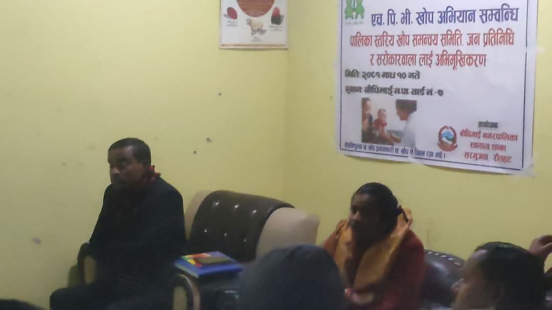 अरमान कुमार उपाध्याय माघ १० गते बौधिमाई नगरपालिका स्वास्थ्य शाखा को आयोजना मा HPV खोप कार्यक्रम प्रमुख प्रशासकीय अधिकृत संदेश कुमार यादवको अध्यक्षतामा सम्पन्न भएको छ।यस खोप कार्यक्रम को प्रमुख अतिथि नगर प्रमुख प्रदिप कुमार यादव ,बिशिस्ट अतिथि नगर उपप्रमुख प्रमिला जयस्वाल वडा अध्यक्ष मुक्ति नारायण मिश्रा ,तुरन्त नारायण ,रामजोधी राउत, शिक्षा संयोजक ,रमेश यादव ,लेखा प्रमुख अरबिन्द यादव पुर्व निमित्त प्रमुख प्रशासकिय अधिकृत रहेका थिए ।उक्त नगर स्तरिय खोप समन्वय समितिको एच.पी.भी. खोप अभियानमा रौतहटका सम्पूर्ण सामुदायिक विद्यालय र प्राइवेट स्कुलहरुमा यही २०८१ माघ २२ देखि फागुन ६ गते सम्म भएपनि मधेश प्रदेशको आठ वटै जिल्लाहरुमा माघ २२ देखी फागुन ६ सम्म तथा बौधिमाई नगरक्षेत्रमा यही माघ २३ देखि २६ गते सम्म लगातार चार दिनसम्म लक्षित समूह अन्तर्गतका कक्षा ६ देखि कक्षा १० सम्मका छात्राहरू तथा विद्यालय नजाने १० वर्ष देखि १४ वर्ष उमेर समूहका किशोरीहरूलाई एच.पि.भी खोप दिइने बताईएको छ। साथै यो खोप विद्यालय केन्द्रित खोप केन्द्रहरूबाट दिइने भएकाले विद्यालयमा सम्पर्क गरि खोप लगाउनु हुन बौधिमाई नगरपालिकाको नगर प्रमुख प्रदिप कुमार यादव ले अनुरोध गरेका छन।कार्यक्रममा पाठेघरको मुखको क्यान्सरले विश्वमा हरेक वर्ष ५ लाख ७० हजार महिलालाई हुने र सन् २०३० सम्ममा ७ लाख सम्म पुग्ने अनुमान गरिएको छ । यसबाट हरेक वर्ष ३ लाख १९ हजार जना महिलाहरुको मृत्यु हुने र सन् २०३० सम्ममा मृत्युदर ४ लाख सम्म पुग्ने अनुमान गरिएको छ। महिलाहरुमा पाठेघरको मुखको क्यान्सर चौथो मुख्य क्यान्सर रहेको बताईएको छ।