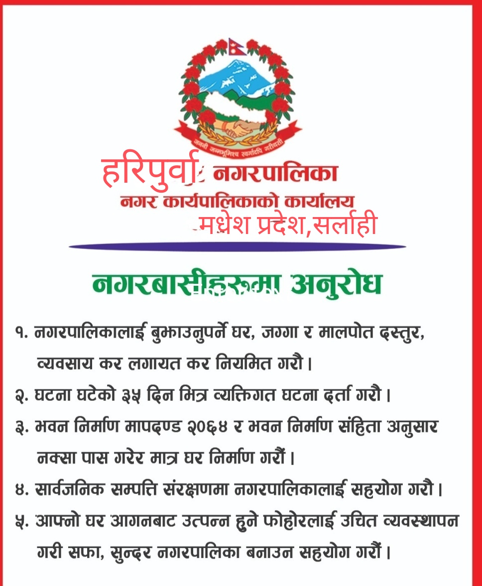 घर Uncategorized हरिपुर्वा नगरपालिका द्वारा जनहितमा जारी संदेश हरिपुर्वा नगरपालिका द्वारा जनहितमा जारी संदेश द्वारा Gujaramai Media Desk - १२ महिना अगाडि 19 FacebookTwitterPinterestWhatsApp यो खबर पढेर तपाईलाई कस्तो महसुस भयो ? +1 0 +1 0 +1 0 +1 0 +1 0 Facebook Twitter Email सम्बन्धित लेखलेखक बढी झापामा बालेन साहलाई निशुल्क घर, चुनावी प्रचारमा केपी ओली र बालेन साहबीच प्रतिस्पर्धा चर्किँदै २११औँ पर्सागढी विजय उत्सव भव्य रूपमा सम्पन्न सामाजिक सञ्जाल मनोरञ्जनको माध्यम मात्र होईन अन्यायको विरोध गर्ने ठाउँ पनि हो सिफारिस रौतहटमा श्री विष्णु महायज्ञ २०८२ को भव्य उद्घाटन ३ दिन अगाडि श्रीराम चिनिमिल्स पुनः सञ्चालनको माग २ हप्ता अगाडि बौधिमाई नगरपालिकामा HPV खोप सम्बन्धी पालिका स्तरीय अभिमुखीकरण कार्यक्रम सम्पन्न २ महिना अगाडि रौतहटको माधवनारायण नगरपालिकाको प्रशासनिक भवन नमूना बन्दै २ महिना अगाडि बौधिमाई नगरपालिकाद्वारा जनहितमा स्वास्थ्य सन्देश जारी २ महिना अगाडि लोड