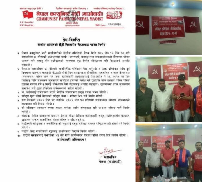 जेठ  १८               अरमान कुमार उपाध्याय                                                         नेपाल  कम्युनिष्ट पार्टी माओवादीको केन्द्रीय समितिको बैठकले प्रेस विज्ञाप्ती मार्फत निर्यणहरु सार्वजनिक गरेको छ ।