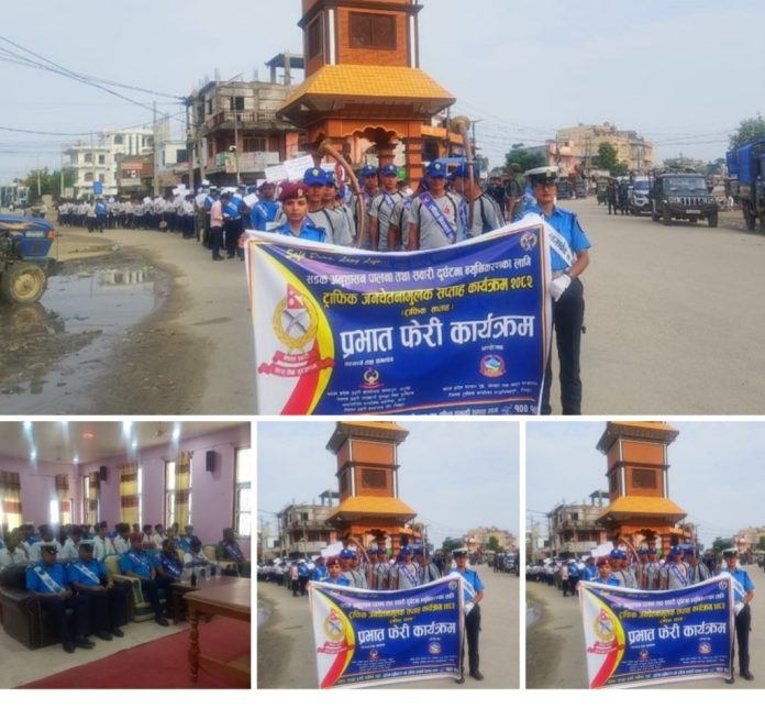 ट्राफिक साप्ताहको प्रारम्भ सहरका मुख्य मार्गहरू हुँदै निकालिएको प्रभातफेरीबाट गरिएको थियो। प्रभातफेरी गौरको बीपी चौकबाट सुरु भई विभिन्न स्थानहरू परिक्रमा गर्दै सभाहलमा पुगेर मञ्चीय कार्यक्रममा परिणत भएको थियो। स्थानीय संगीत, बाजागाजा र सूचना मूलक प्लेकार्डहरूका साथ निकालिएको उक्त प्रभातफेरीले आम सर्वसाधारणको ध्यान आकर्षण गरेको थियो।