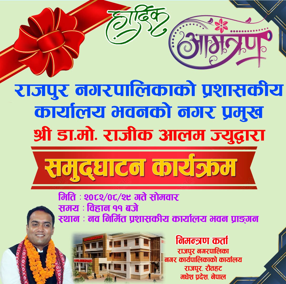राजपुर (रौतहट) — राजपुर नगरपालिकाको नव–निर्मित प्रशासनिक कार्यालय भवनको उद्घाटन मंसिर २९ गते सोमबार को दिन भव्य रूपमा सम्पन्न हुने भएको छ। नगर प्रमुख श्री डा. मो. राजिवक आलम ज्यूको प्रमुख आतिथ्यतामा भवन उद्घाटन तथा सम्बोधन कार्यक्रम आयोजना गर्न लागिएको हो।