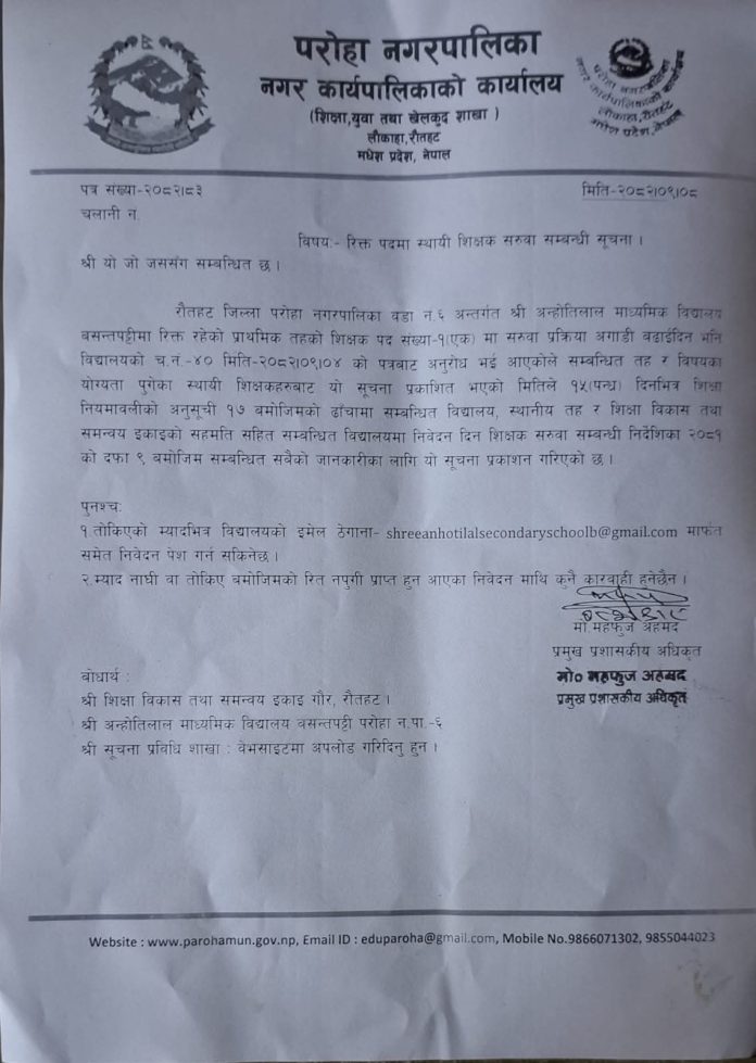 रौतहट । परोहा नगरपालिका, नगर कार्यपालिकाको कार्यालय अन्तर्गत शिक्षा, युवा तथा खेलकुद शाखाले स्थायी शिक्षक सेवा पदपूर्तिका लागि सूचना प्रकाशित गरेको छ।