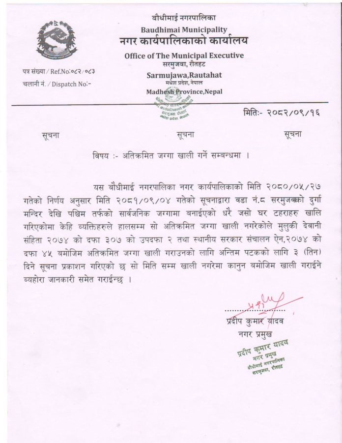 रौतहट । बौधिमाई नगरपालिकाले नगर क्षेत्रभित्र अतिक्रमण गरी बनाइएका संरचना खाली गर्न अन्तिम सूचना जारी गरेको छ। नगर कार्यपालिकाको कार्यालय, सरमुजवा रौतहटले मिति २०८२/०९/१६ गते सूचना प्रकाशन गर्दै सार्वजनिक जग्गामा बनेका घरटहरा हटाउन निर्देशन दिएको हो।